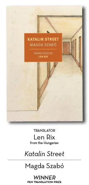 From the judges’ citation: “The jury is proud to honor Len Rix’s exceptional translation of Magda Szabo’s novel Katalin Street, which tracks the intertwined lives of three Budapest families before and after the devastation of World War II. This beautiful translation illuminates Szabo’s deep humanity. Translating Katalin Street‘s intricate, elegant text required tremendous subtlety and artistry to achieve such flawlessness, and Rix clearly possesses the mastery to allow Szabo herself to stand out as an exemplary writer. This translation from the Hungarian does that, and Len Rix has gained lifelong admirers among the jury.”