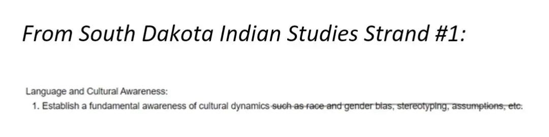 In an August report on compliance with the state’s educational gag order, the South Dakota Department of Education deleted a directive from its teacher education curriculum that students in its required Indian Studies course be made aware of “race and gender bias, stereotyping, [and] assumptions.” The change applies to all public and private colleges in the state, including tribal colleges run by Indian nations. So that there could be no mistaking their intent, the report authors included a scan of the curriculum with the requirement actually crossed out in pen.