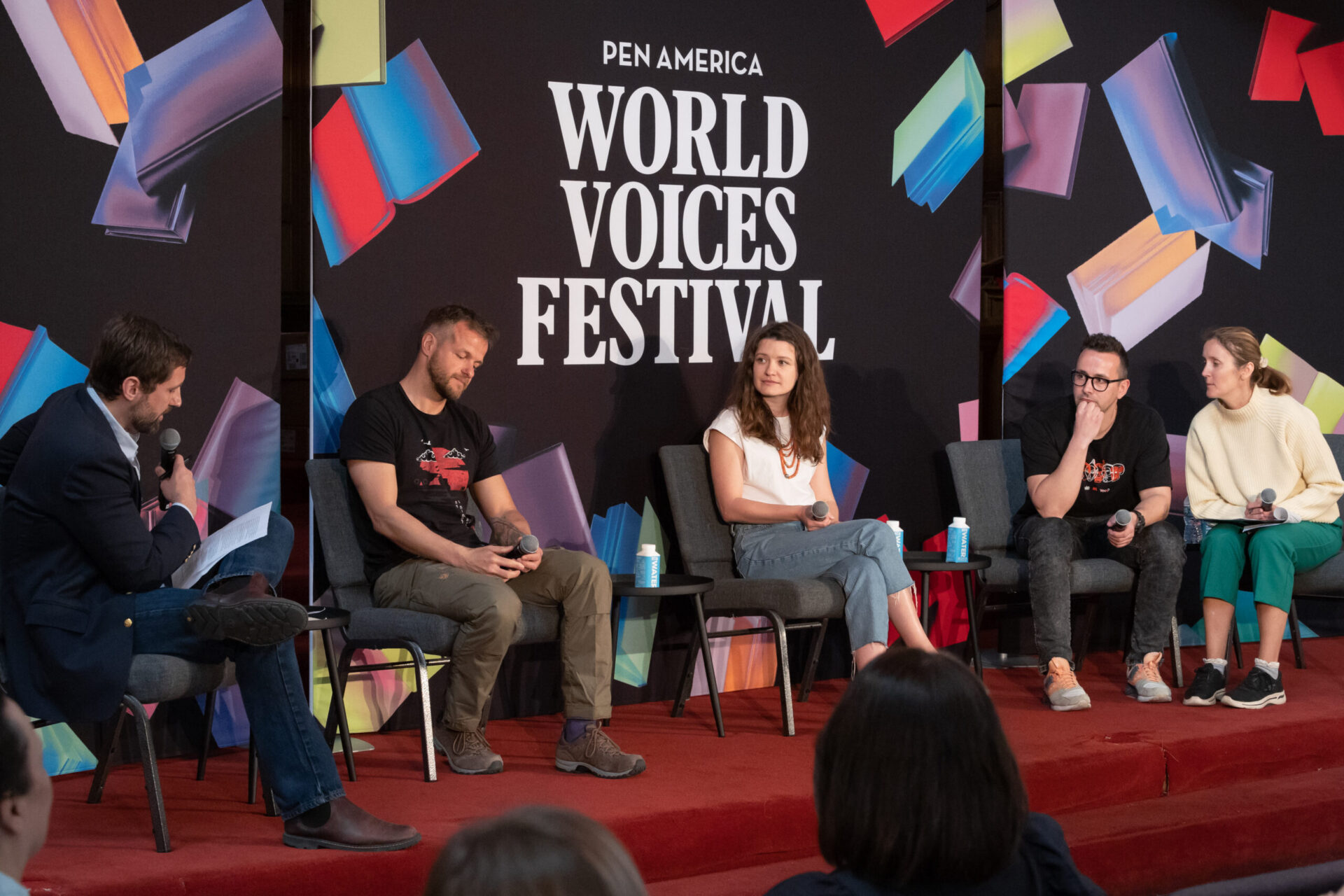 Ukranian Writers at War with Artem Chapeye, Artem Chekh, Iryna Tsilyk, and Phil Klay, Church of the Village, PEN America 2023 World Voices Festival of International Literature, New York, May 2023. Photograph © Beowulf Sheehan/PEN America