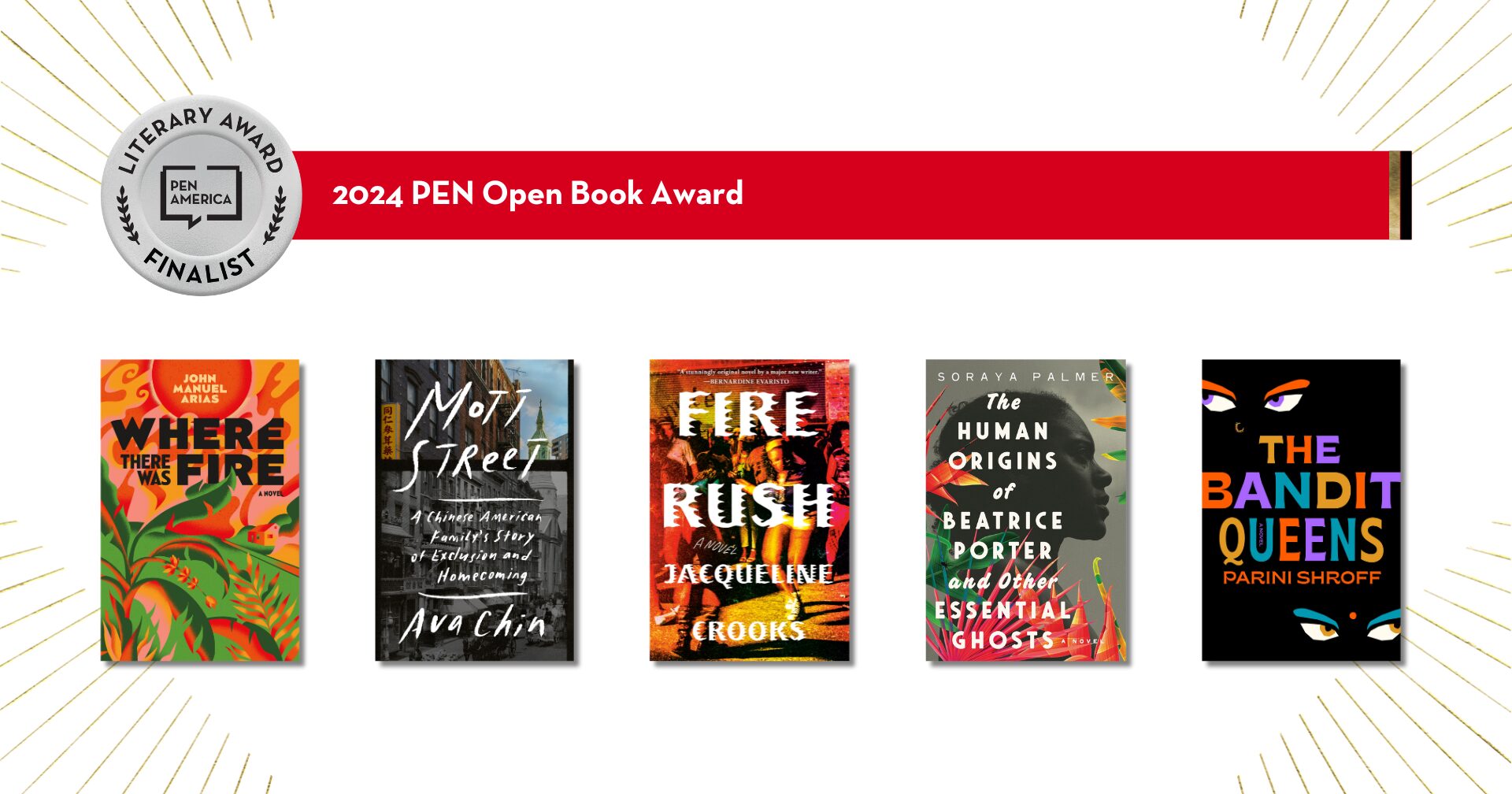 The following title has been withdrawn at the request of the author: Where There Was Fire: A Novel, by John Manuel Arias on Bookshop. The selected winning title will be featured on the PEN/Open Book Award page.