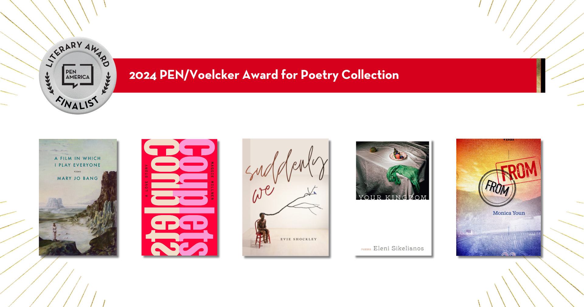 The following titles have been withdrawn from consideration at the request of the author: Trace Evidence by Charif Shanahan, Couplets by Maggie Millner on Bookshop, suddenly we by Evie Shockley on Bookshop, From From by Monica Youn on Bookshop