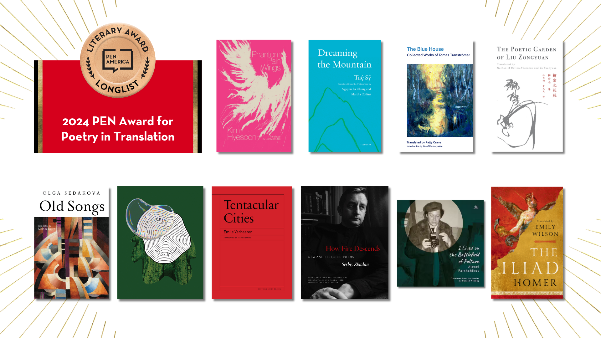 The following titles have been withdrawn from consideration at the request of the author/translator: Phantom Pain Wings by Kim Hyesoon translated from the Korean by Don Mee Choi on Bookshop, The Poetic Garden of Liu Zongyuan by Liu Zongyuan translated from the Chinese by Nathaniel Dolton-Thornton and Yu Yuanyuan on Bookshop, Love Training by Andrés Neuman translated from the Spanish by Robin Myers on Bookshop, Tentacular Cities by Émile Verhaeren translated from the French by Jacob Siefring for purchase here