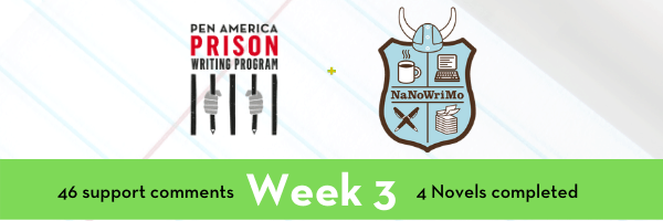 This November, we partnering with National Novel Writing Month (NaNoWriMo) to pilot a new aspect of our mentor program that takes the concept of mentorship out of its one directional engagement (outside mentors, inside mentees) and moves in multiple directions. Four currently incarcerated fiction writers are working as peer facilitators with groups in the prisons where they live. We have updates from week three of the NaNoWriMo challenge. We are so grateful for the feedback and notes we’ve received to share with our participating writers so far, and invite you to send encouragement or share your own updates in the box below.
