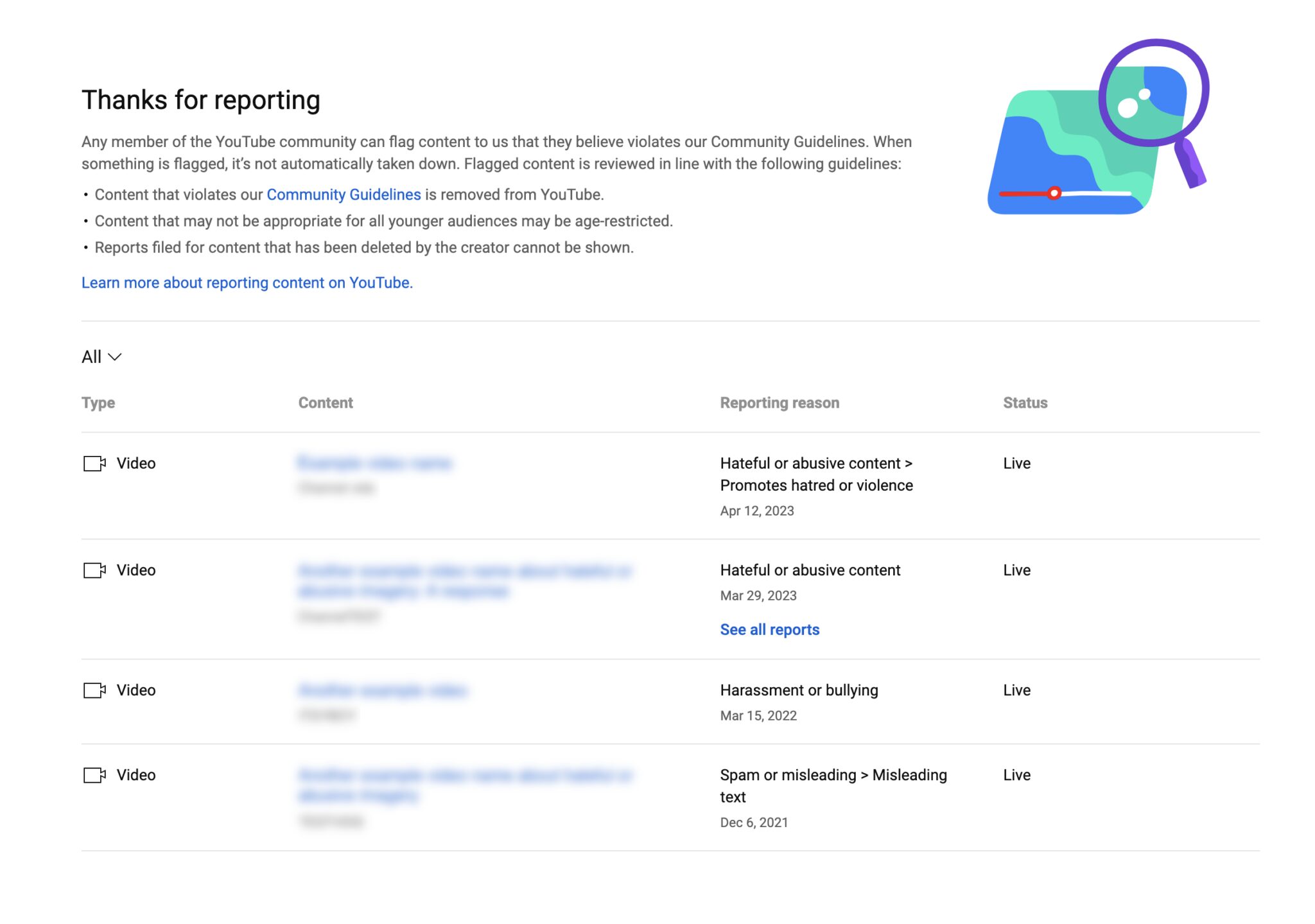 YouTube comes the closest to offering a dashboard for individual users, via its “Report history” section, which is relatively accessible on a desktop, but does not seem to work on mobile. This dashboard allows users to track which videos they have reported, but does not include reported comments, does not indicate where a report is in the review process, and does not include all of the information a user has submitted in the report. Tellingly, it’s actually YouTube’s copyright dashboard, rather than its reporting history dashboard, that provides the kind of information, usability, and accessibility that should exist across all platforms for tracking reports of hate and harassment (for more, see case study below).