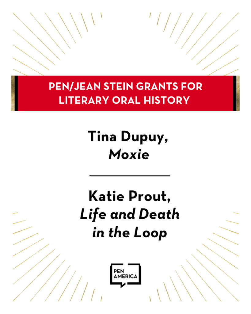 The PEN/Jean Stein Grants for Literary Oral History recognize literary works of nonfiction that use oral history to illuminate an event, individual, place, or movement. The grants are made possible by a substantial contribution from American author and editor Jean Stein, whose groundbreaking work helped to popularize literary oral history. Since 2021, PEN America has conferred two grants with cash prizes of $15,000 each.