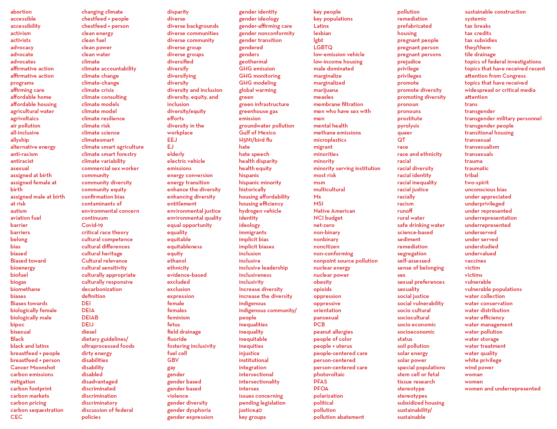 Our list is most assuredly incomplete. The New York Times published a list of words flagged by federal agencies to ban, limit, or avoid. Additional terms were reported by Politico, Reuters, The Washington Post, Propublica, Science, Gizmodo, 404 Media, Popular Information, Politico’s E&E News and the nonprofit news outlet More Perfect Union. These have been aggregated into a single list, below, which also reflects guidance from the Centers for Disease Control and Prevention, the Department of Agriculture, the Department of Defense, Department of Energy, the Federal Emergency Management Agency, the Food and Drug Administration, NASA, the National Cancer Institute, the National Security Agency, the National Science Foundation, and the White House itself.