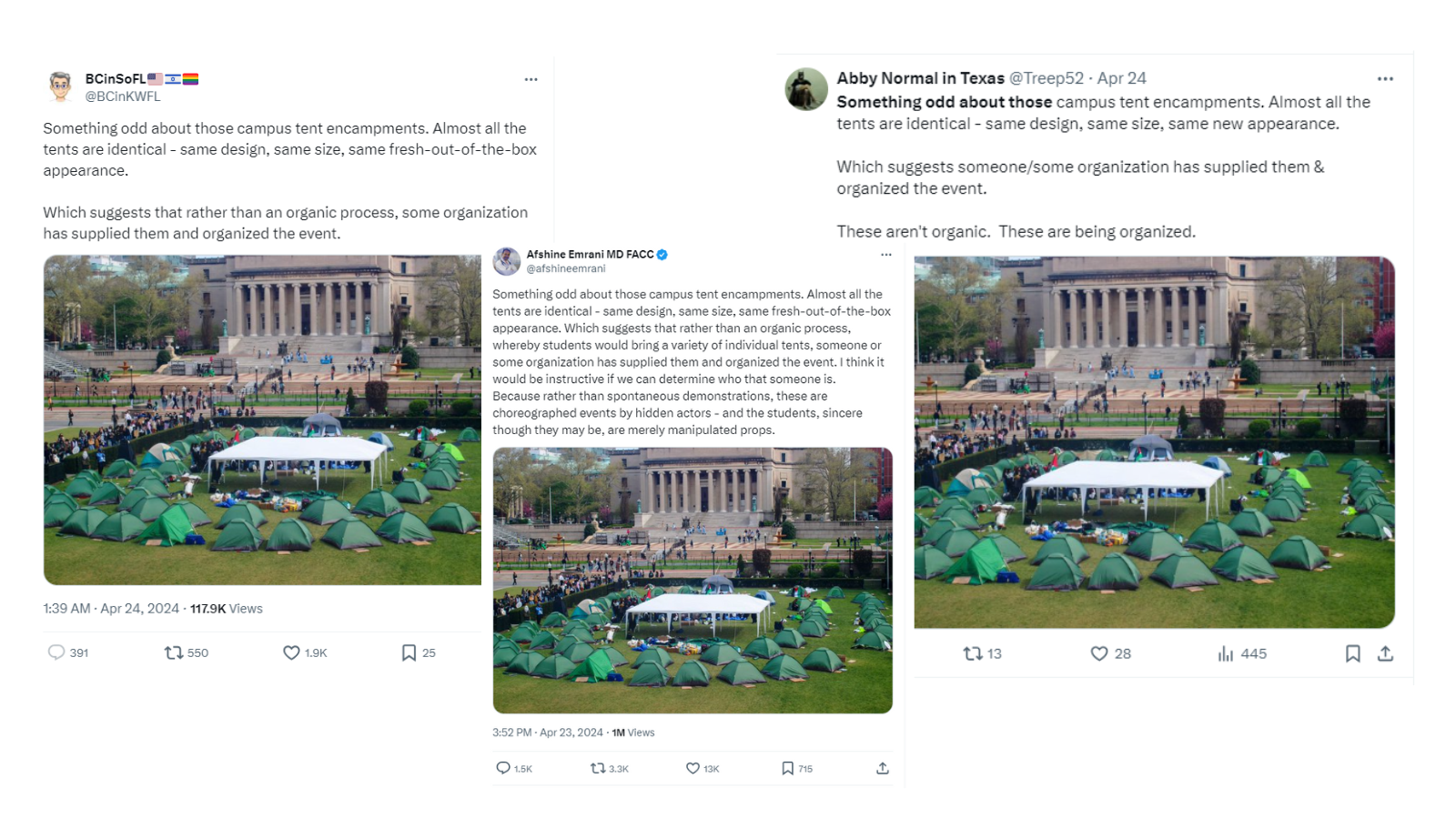 Online, hundreds of posts on X and Facebook circulated the same copy-pasted language about the tents, alongside a photo taken by a photographer at the Columbia student newspaper, The Columbia Daily Spectator. The posts again questioned why many of the student protesters at Columbia had the same tent, insinuating they had been provided by “outside agitators.”