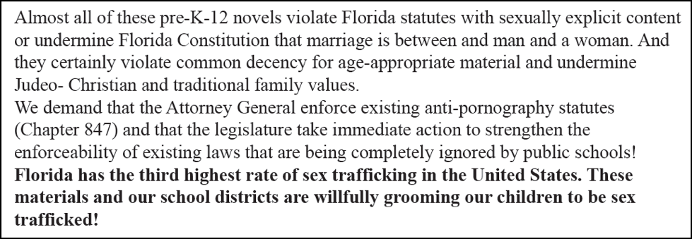 All exhibits included in this update come from publicly available documents and were excerpted as they appear in the FLCA’s 2021 “Porn in Schools Report” or the review forms linked from it.