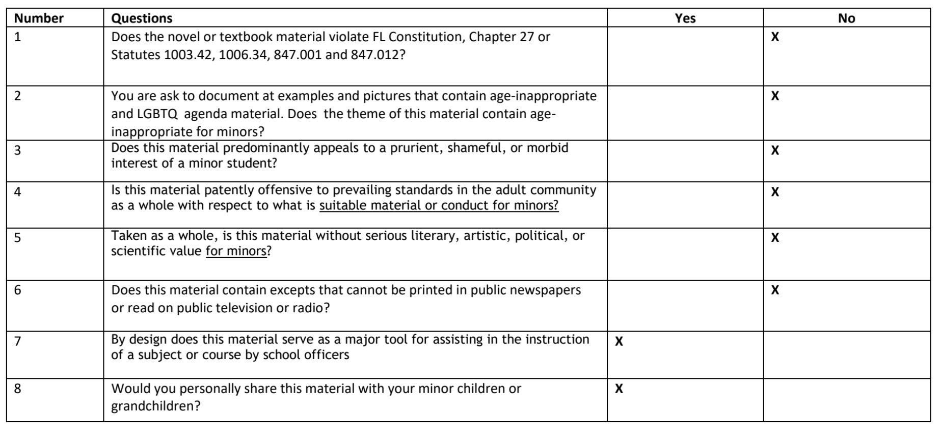 Despite the FLCA’s charge that the books listed violate Florida law, there is no indication that the volunteer-only reviewers, identified only by last name and county, have the particular experience or knowledge required to support such an allegation. There is, for example, no indication that any of these reviewers were educators or librarians, that they had particular knowledge of Florida law or jurisprudence related to obscenity, or that they were even parents of school-aged children. Nonetheless, these volunteers were assigned specific books to read and directed to fill-in review templates for them, where they assessed the content and value of the books on a range of questions, such as whether they violate specific Florida statutes, whether they are “obscene” by meeting aspects of the U.S. Supreme Court’s long-standing test for obscenity (known as the Miller test), and whether they are “appropriate” for schools and minors. Further, many of these questions are subjective or involve judgments that require professional expertise–like whether a book could be a “major tool for assisting in the instruction of a subject or course” and whether it could be “printed in public newspapers or read on public television or radio.”