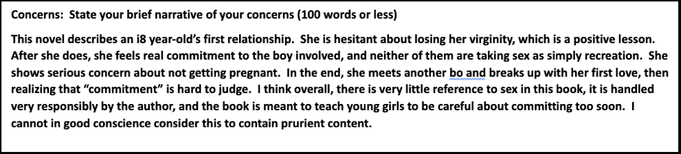 Given legal experts’ conclusions that the books that have become controversial for their alleged sexual content in the past year would not meet the legal definition of obscenity, it seems highly doubtful that these reviews should be treated as authoritative.