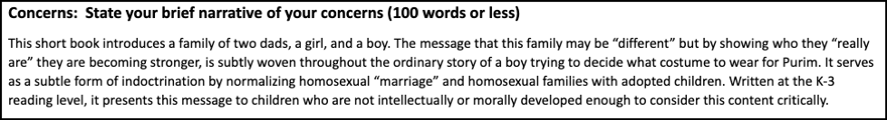 For example, the review of The Purim Superhero linked in the report finds evidence of “bias and indoctrination,” and that the book “is subjecting all readers to LGBTQ agenda.” Yet the examples offered by the reviewer only include dialogue and pictures of two dads with their children. While the reviewer does acknowledge that the book does not appeal to a “prurient, shameful, or morbid interest of a minor,” they make it clear that they found the family in the story unacceptable and dangerous for younger readers. They responded to the review template affirming that the book is “patently offensive to prevailing standards in the adult community as a whole with respect to what is suitable material or conduct for minors.” As shown in an excerpt from the review below, the entire basis for this assertion rests on the opinion of the reviewer that “normalizing homosexual ‘marriage’ and homosexual families with adopted children” is “a subtle form of indoctrination.” This is an argument rooted in anti-LGBTQ+ hate; it should not be taken as a serious basis on which to restrict access to a book in a pluralistic democracy committed to free expression and individual liberty.