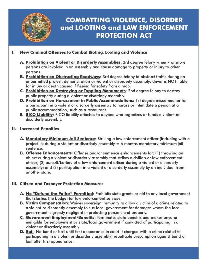 A pared-back version of the Combatting Violence Act was introduced in both the Florida House and Senate (as HB 1 and SB 484) in January. The legislation makes blocking traffic punishable by up to 15 years in prison, creates vaguely defined offenses relating to riot and so-called “mob intimidation,” makes destroying or demolishing a memorial a second-degree felony, offers a measure of legal immunity to anyone who injures protesters convicted of riot, and opens municipal governments to lawsuits if they interfere in providing “reasonable law enforcement protection during a riot or unlawful assembly.” On April 15, 2021, the bill passed both chambers. On April 19, DeSantis signed the bill into law.