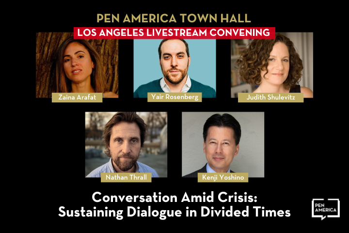 Join us and fellow LA-based members for the Los Angeles livestream of PEN America’s Annual General Meeting and a timely conversation with Arab-American fiction and nonfiction writer Zaina Arafat; journalist and translator Yair Rosenberg; journalist, editor, and cultural critic Judith Shulevitz; writer and former Director of the Arab-Israeli Project at the International Crisis Group Nathan Thrall; and author, lawyer, and equity advocate Kenji Yoshino as we interrogate the challenge of keeping civic discourse alive amid deep schisms. The discussion will examine the ripple effects of the conflict on the cultural, academic, and literary ecosystem in the United States. Through this conversation, we will endeavor to cultivate a space where writers and thinkers can navigate fraught topics by demonstrating a willingness to listen, engage, and learn.