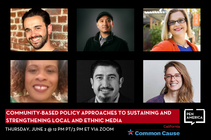 In collaboration with the California Media & Democracy Working Group, California Common Cause and PEN America invite you to join this timely conversation about strategies for community-based policy models that could help rebuild and sustain a robust news information ecosystem in California.