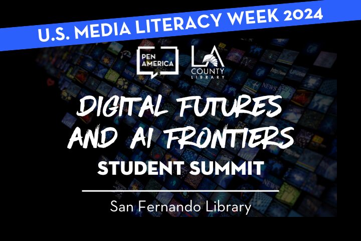 PEN America and LA County Library are excited to announce our Digital Futures and AI Frontiers Student Summit at San Fernando Library for U.S. Media Literacy Week 2024! In this convening, high school students will be welcomed to engage with each other and youth advocacy leaders from PEN America in a series of workshops analyzing emerging opportunities and threats to freedom of expression online including the rise of artificial intelligence.