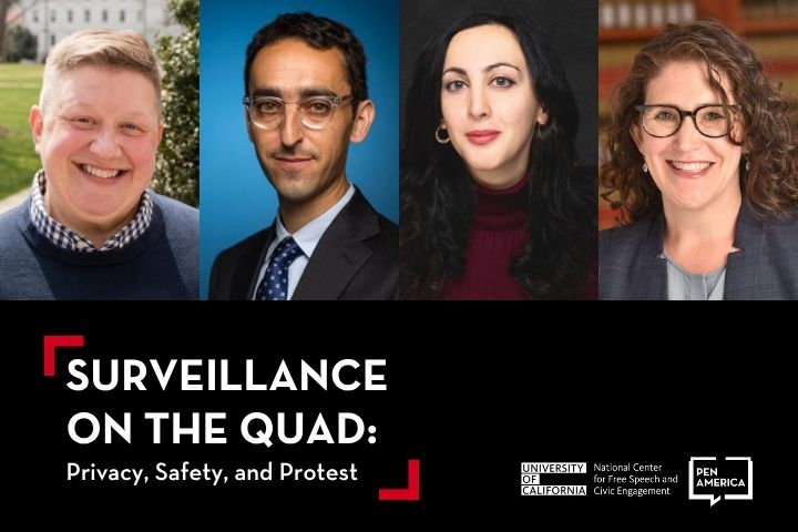 Campus protest activity in recent years has coincided with an increase in surveillance of students via campus police, facilities management, and technology policies. Some argue that this is necessary to respond to criminal conduct such as vandalism and to support student safety. Others allege that increased monitoring leads to a deep chilling of protected expression, especially given how easy social media makes it to record and expose student demonstrators. Join a panel of experts to explore the challenges in navigating digital spaces, student safety, free expression, and civil rights from theoretical and practical perspectives.
