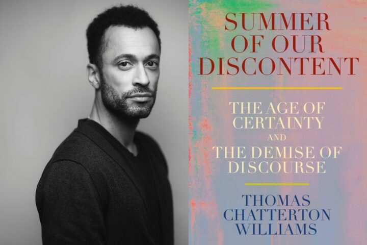 Black and white portrait of a man with short hair and a beard on the left; on the right, the book cover for Summer of Our Discontent by Thomas Chatterton Williams with colorful pastel background and bold text.