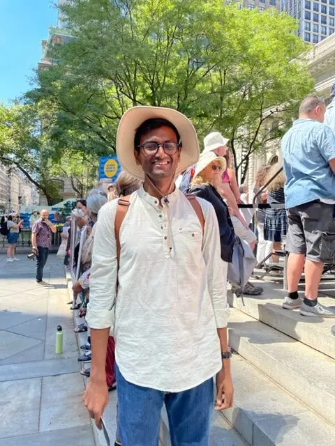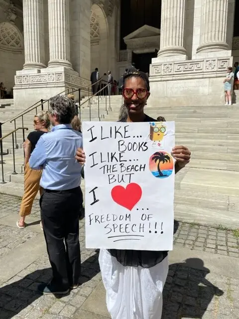 Readers who admire his books, along with New Yorkers horrified by the attack and determined to stand in solidarity, showed up by the hundreds Friday morning on the library’s plaza steps in midtown Manhattan. They heard Rushdie’s incomparable words along with an outpouring of admiration, concern, and love. Online a global audience watched via livestream, and shared messages of support on social platforms. Joining PEN America as hosts were Rushdie’s publisher, Penguin Random House, the House of SpeakEasy, and the New York Public Library, whose stately Beaux Arts building on Fifth Avenue and 42nd Street framed the outdoor readings under a blazing sun. Rushdie had given several talks at the library focused on free expression and free speech over the years.