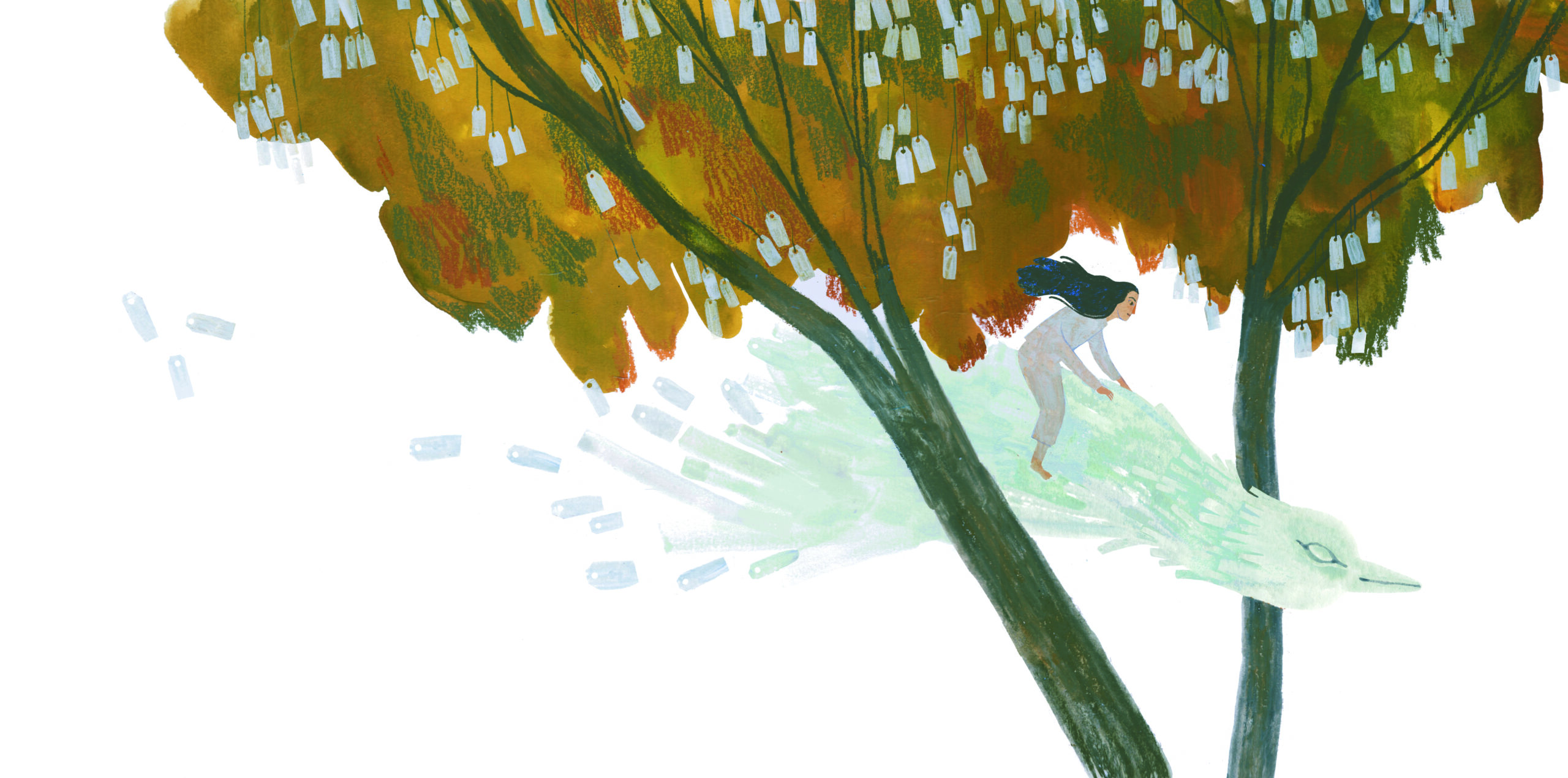 That theme is certainly reflected in the beautiful illustrations in the book, which I found captivating and so, well, beautiful. It’s like a piece of art on its own. Yas, your illustrations include many references to birds – one seems to peck at her as she practices piano, another rises from the firebombing of Tokyo, and in the end, Yoko rides a bird before watching doves fill the sky. What drew you to the bird imagery?