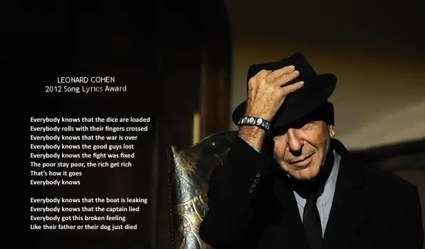 Leonard Cohen is a poet, novelist, and singer songwriter famous for writing and recording such classic songs as “Bird on a Wire,” “Suzanne,” “So Long, Marianne,” “Sisters of Mercy,” “Chelsea Hotel #2,” “Everybody Knows,” and “Hallelujah.” His poems have earned wide acclaim, and Michael Ondaatje called Cohen’s 1966 cult novel Beautiful Losers “the most vivid, fascinating and brave modern novel I have read.”