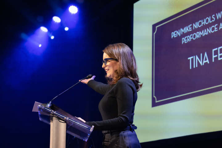 Fey’s longtime collaborator Rachel Dratch presented the PEN/Mike Nichols Writing for Performance Award to Fey and joked, “Tina, I will say this. If I had one wish for you tonight, it would be that you had written this speech I am giving in your honor. It would be far wittier and, let’s face it, your speech would probably be turned into a Broadway play that could then become a movie that could in turn be a musical and then a movie musical and then back into a Broadway play and then into an avant garde performance piece downtown. If Tina wrote this speech about herself it would…make you laugh out loud, it would include some sort of social satire, probably with a feminist bent that would make you say YES! LADY POWER!! But nothing cringey, you would be belly-laughing and maybe not even realize you had learned something about society along the way.”