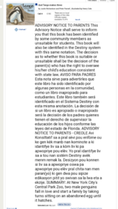 (NEW YORK)– PEN America has found that the Collier County School District in Florida has attached a warning to the description label on over 100 books listed on the district’s online library catalog and physical labels were affixed to hard copies of the same books. The books receiving these warnings disproportionately include stories featuring LGBTQ+ characters and plot lines and titles about communities of color.