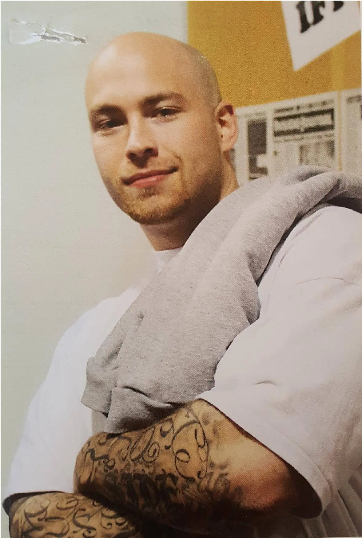 A man with a shaved head and tattoos on his forearms stands with his arms crossed, wearing a white shirt and a gray sweatshirt draped over his shoulder, smiling slightly. There are blurred posters and newspapers in the background.