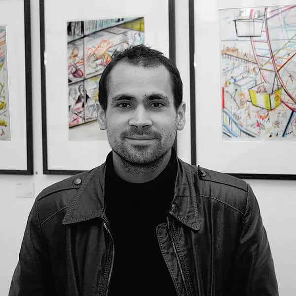 A man with short dark hair, wearing a black jacket and turtleneck, stands indoors in front of colorful abstract art displayed on a wall.