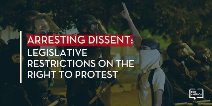 Basic democratic rights have increasingly come under siege since the 2016 election, and not just at the federal level. In this report, Arresting Dissent: Legislative Restrictions on the Right to Protest, PEN America shines a spotlight on the proliferation of state-level legislative proposals seeking to limit protest rights.