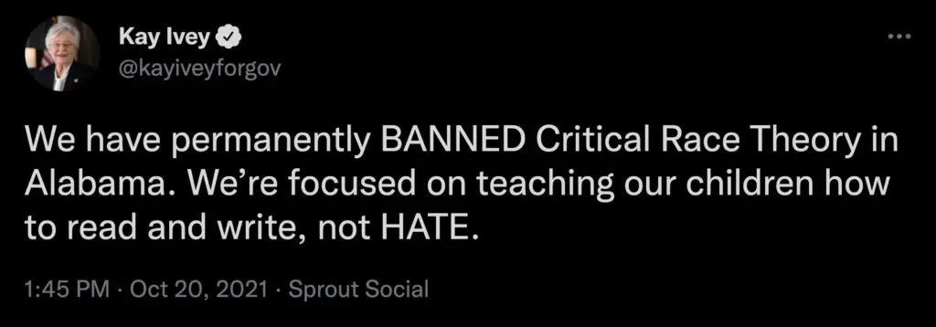 Alabama Governor Kay Ivey voices her support for banning critical race theory on Twitter. Over the past year, some Republican officials have become increasingly vocal about their efforts to legislate bans on critical race theory in educational institutions.