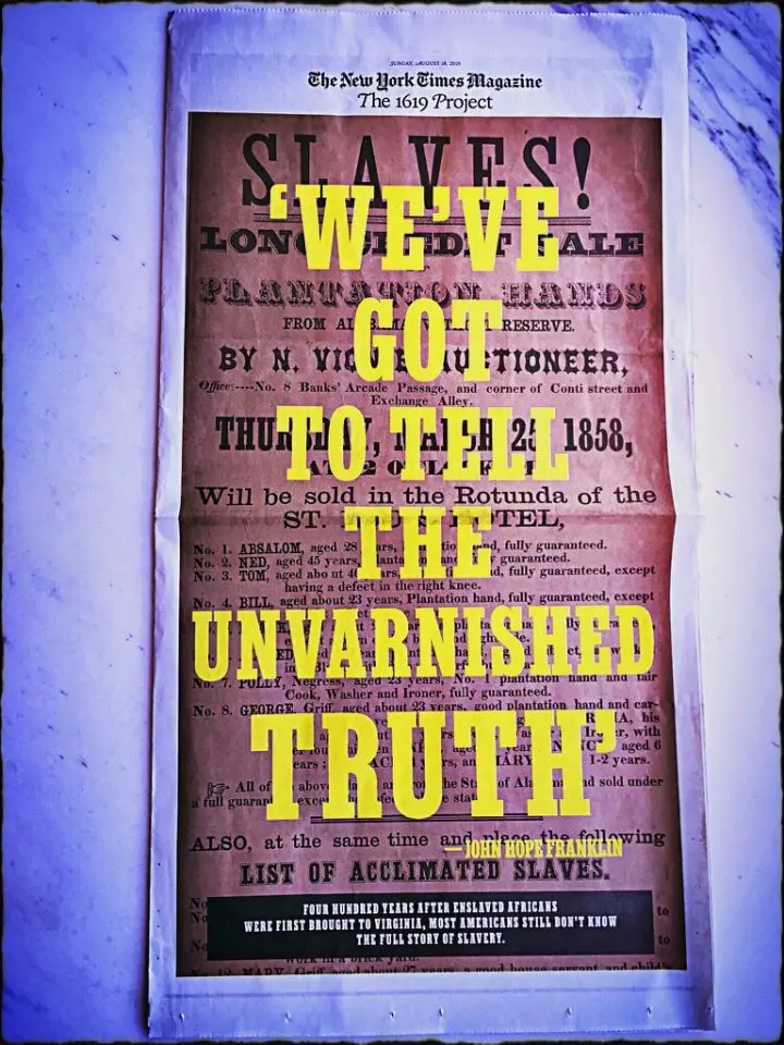 The 1619 Project is an initiative, led by New York Times journalist Nikole Hannah-Jones, to explore the impact of slavery on U.S. history and modern life. In August 2019 The New York Times Magazine published a special issue “containing essays on different aspects of contemporary American life, from mass incarceration to rush-hour traffic, that have their roots in slavery and its aftermath.” The Times partnered with the Smithsonian’s National Museum of African-American History and Culture to create a visual history of slavery in the United States.23Jake Silverstein, “Why We Published The 1619 Project,” The New York Times, December 20, 2019, nytimes.com/interactive/2019/12/20/magazine/1619-intro.html; Mary Elliott and Jazmine Hughes, “Four hundred years after enslaved Africans were first brough to Virginia, most Americans still don’t know the full story of slavery,” The New York Times Magazine, August 18, 2019, nytimes.com/interactive/2019/08/19/magazine/history-slavery-smithsonian.html In addition, more than a dozen original literary works were commissioned from contemporary Black writers to “bring to life key moments in American history.”24Jake Silverstein, “Why We Published The 1619 Project,” The New York Times, December 20, 2019, nytimes.com/interactive/2019/12/20/magazine/1619-intro.html The project asked readers to imagine that 1619, the year enslaved people were first brought to North America, was “our nation’s birth year. Doing so,” it posited, “requires us to place the consequences of slavery and the contributions of black Americans at the very center of the story we tell ourselves about who we are as a country.”25“The 1619 Project,” The New York Times Magazine, nytimes.com/interactive/2019/08/14/magazine/1619-america-slavery.html; Jake Silverstein, “Why We Published The 1619 Project,” The New York Times, December 20, 2019, nytimes.com/interactive/2019/12/20/magazine/1619-intro.html The Times selected the Pulitzer Center, which runs fellowships and grants for journalists and develops curricula based on journalism, to produce a companion curriculum.26Jeff Barrus, “Pulitzer Center Named Education Partner for The New York Times Magazine’s ‘The 1619 Project’,” The Pulitzer Center, August 14, 2019, pulitzercenter.org/blog/pulitzer-center-named-education-partner-new-york-times-magazines-1619-project. The Pulitzer Center is not affiliated with Columbia University’s Pulitzer Prizes, it was endowed by the wife of Joseph Pulitzer, Jr. the grandson of Joseph Pulitzer who founded Columbia’s journalism school and endowed the prizes which bear his name. See “About the Pulitzer Center,” pulitzercenter.org/about/our-mission-and-model, “Emily Raugh Pulitzer, President of the Board,” pulitzercenter.org/people/emily-rauh-pulitzer, “Emily Rauh Is Married To Joseph Pulitzer Jr.,” The New York Times, July 1, 1973, nytimes.com/1973/07/01/archives/emily-rauh-is-married-to-joseph-pulitzer-jr.html.