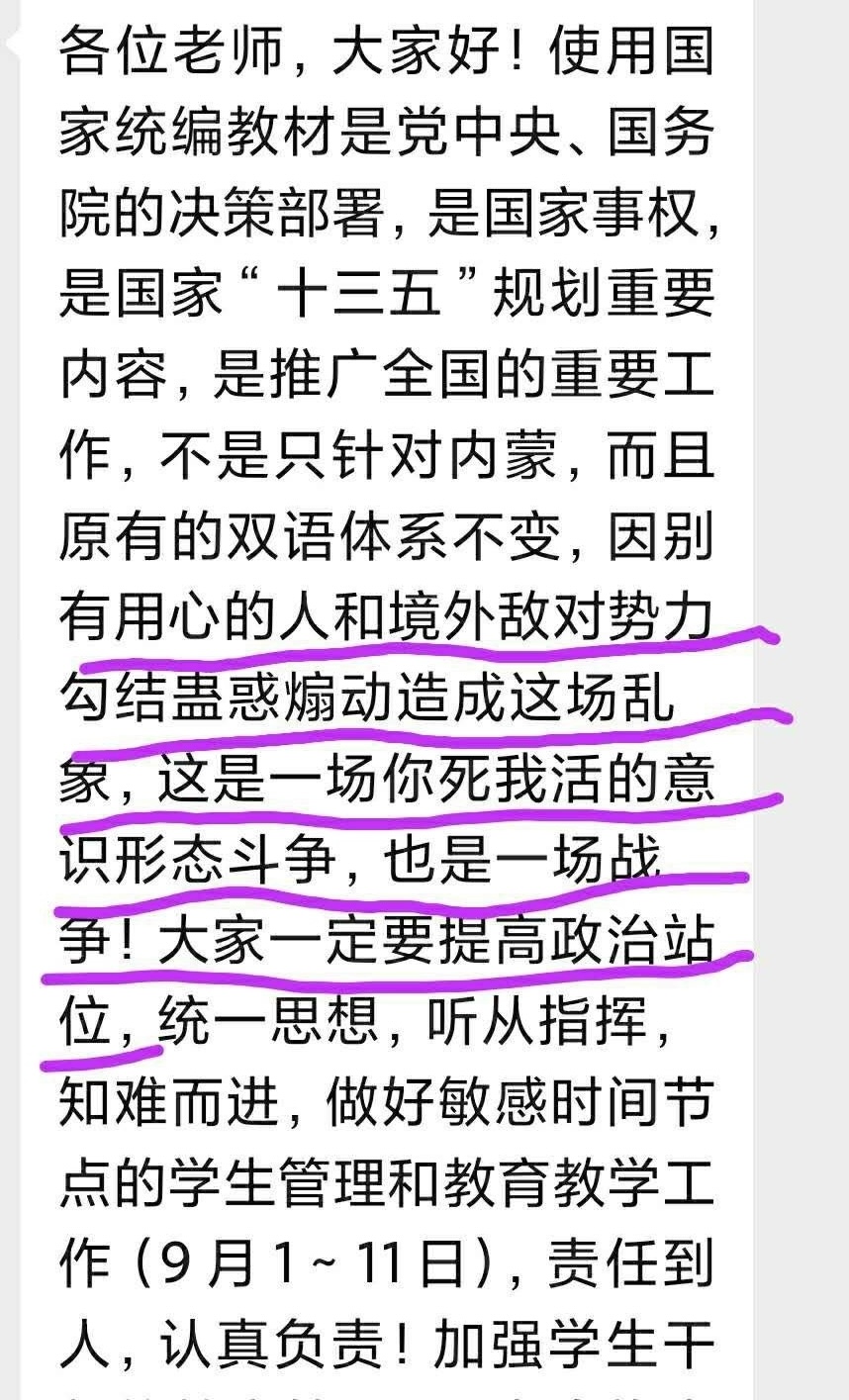 Prior to this policy, bilingual and Mongolian-language instruction had been available to Mongolian students and families, and high school and college exams were conducted in Mongolian. The instruction and economic incentives did not reflect a true state embrace of the Mongolian language—what was taught was not designed to produce Mongolian intellectuals and professions and job opportunities tended to be in Mandarin Chinese,23Disi Ai, Juup Stelma, and Alex Baratta, “The multilingual lived experience of Mongol-Chinese in China,” Journal of Multilingual and Multicultural Development 45, no. 9 (2024): 3662-3677, doi.org/10.1080/01434632.2022.2116450 but the opportunities to maintain their mother tongue existed.