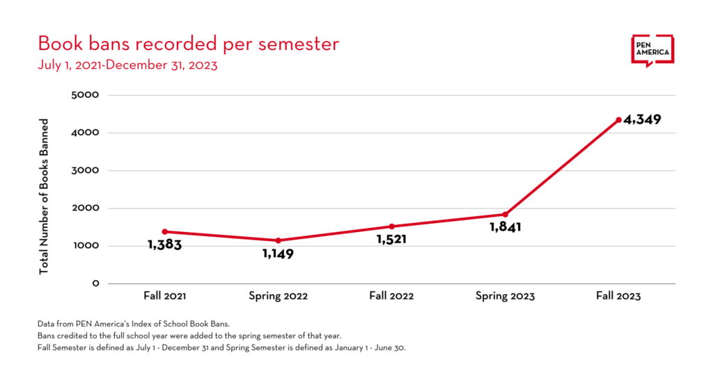 The bans are speeding up. There were over 4,000 instances of book bans in the first half of this school year—more than all of last school year as a whole. This is a marked increase in comparison to the last spring semester, in which PEN America recorded 1,841 book bans.