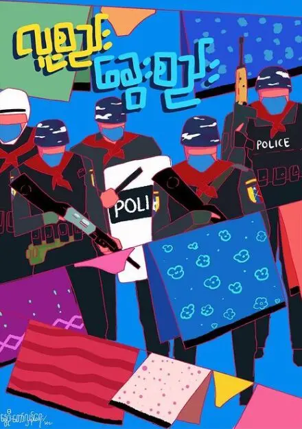 After the coup, many creative artists necessarily began focusing on their level of personal risk and survival. A visual artist popular for anti-military illustrations explained: “I’d been living in my comfort zone with nothing to care about, and then suddenly I had to think about and take responsibility for my actions.”221Interview conducted with a visual artist (#1) on August 31, 2021 Another visual artist with a strong youth following stated: “I know that artists have always been repressed in Myanmar, but since the coup I’ve had to increasingly check myself to avoid bringing trouble upon myself and my family.”222Interview conducted with a visual artist (#3) on September 1, 2021 Referencing the military in particular carries new threats: “Expressing anything about the revolution against the military has gradually become more difficult,” stated one hip-hop musician.223Interview conducted with a musician (#8) on September 18, 2021 “It’s obvious when the military becomes more concerned about certain subjects because they go out and arrest people. For example, pointing out the military’s failures has become even more sensitive than before,” added a visual artist with experience creating viral anti-military content.224Interview conducted with a visual artist (#3) on September 1, 2021 Any reference to the military leader, Senior General Min Aung Hlaing, attracts particular military interest, according to an older visual artist: “Artists have to avoid talking about Min Aung Hlaing for a while.”225Interview conducted with a visual artist (#4) on September 1, 2021