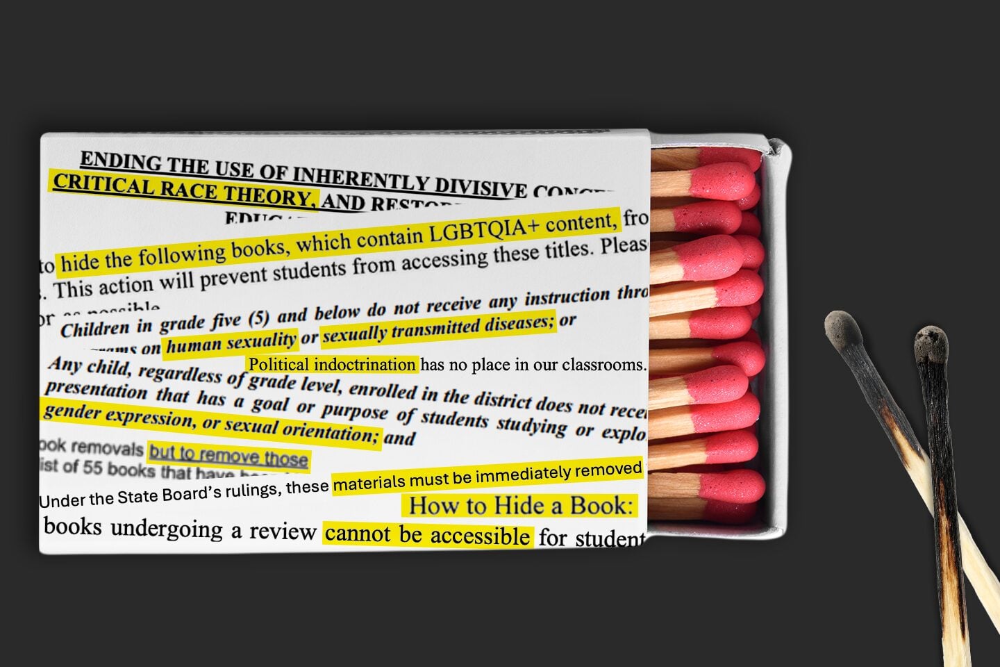 On a dark background is a matchbox with clippings of text relating to legislation and banning books including “...hide the following books, which contain LGBTQ themes,” “Political Indoctrination has no place in our classrooms,” and “Under the State Board’s rulings, these materials must be immediately removed”. Beside the matchbox are two used matches.