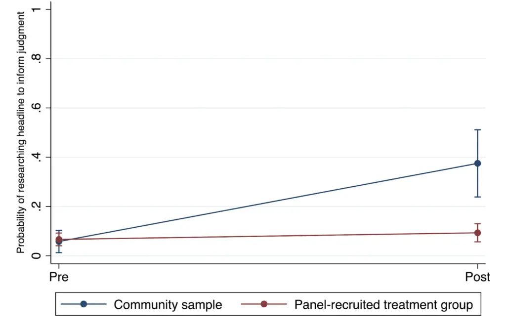 The researchers first estimated a logistic regression in which the DV was whether (1) or not (0) an individual reported doing research on a headline to inform their judgment of its veracity. IVs were sample (0 = community-recruited sample, 1 = YouGov panel-recruited sample), time (0 = pre-intervention, 1 = post-intervention), and their interaction. The results reveal that the community-recruited sample became significantly more likely to do research on headlines after the intervention relative to before compared to the panel-recruited sample (β = -1.91, SE = 0.51, p < .001). Both samples were not very likely to report doing research on headlines before the intervention, but after the intervention the community-recruited sample reported doing research 37.5% of the time while the panel-recruited sample reported doing research only 9.3% of the time (see Figure 6).