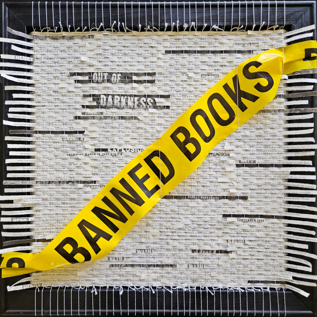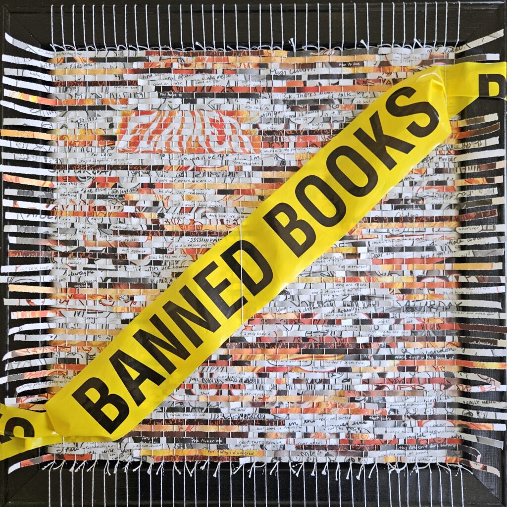 This fall, Artist Ellis Angel’s latest weaving series, The Censor’s Cut: Weavings for Intellectual Freedom, did not hang in a gallery or an art fair, but at a bookstore in Tulsa, Oklahoma. At Magic City Books, titles including A Court of Mist and Fury, Gender Queer, Flamer, and The Perks of Being a Wallflower, did not just sit on shelves but hung transformed–all shredded and rewoven, with the bright yellow “Banned Books” tape plastered across their backs.
