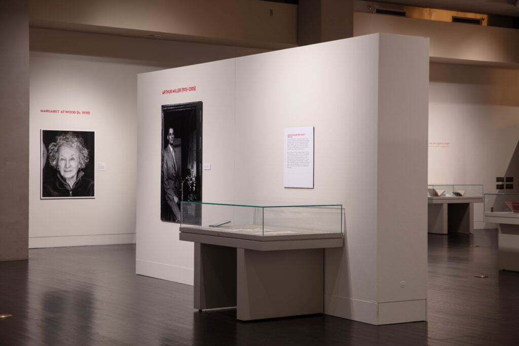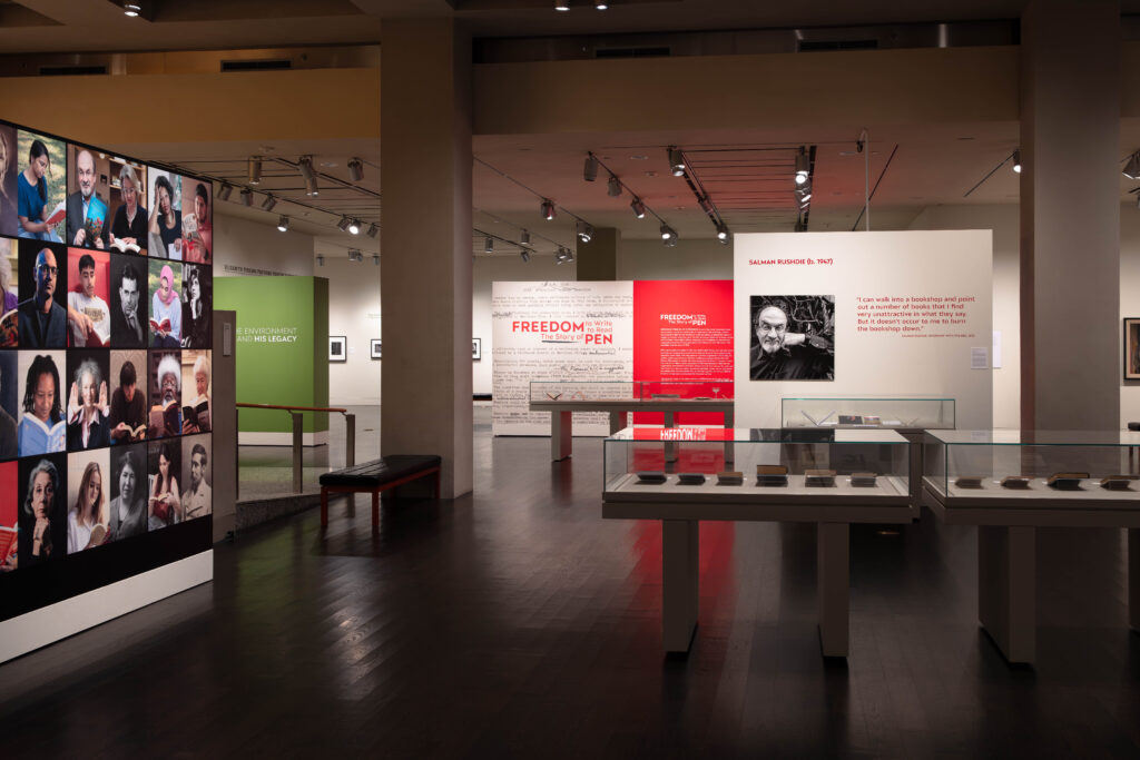 The exhibition displays books banned throughout history and celebrates prominent PEN leaders and Members, including Rushdie, Arthur Miller, Toni Morrison, and Margaret Atwood. It highlights the organization’s advocacy on behalf of women, writers who have been persecuted for their religious beliefs and frequently censored LGBTQ+ authors.