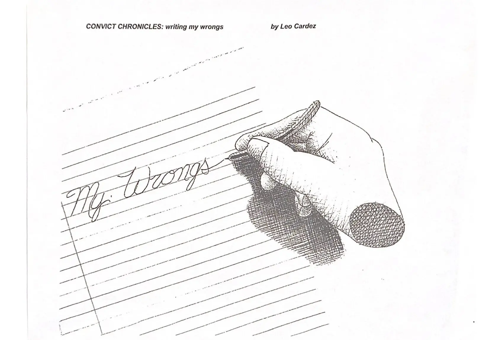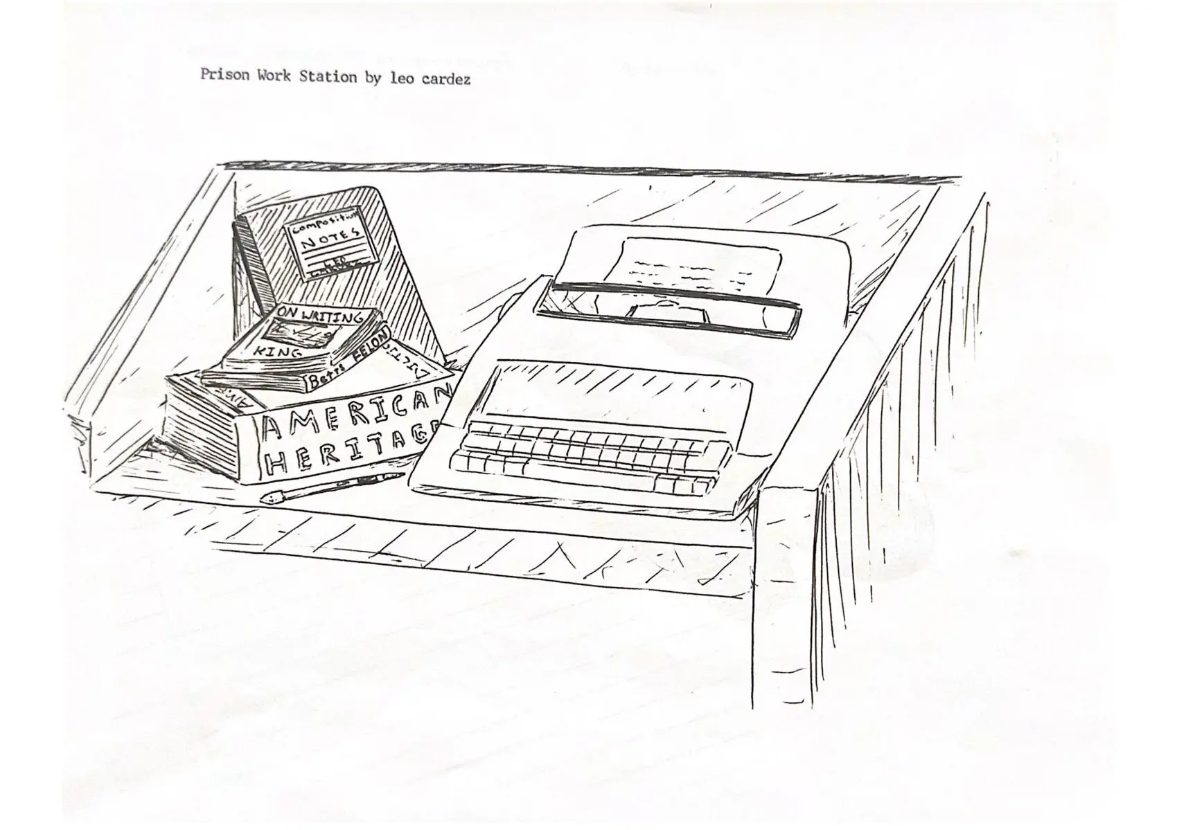Leo Cardez, an avid writer and two-time contest winner, tucked the pen uses to write his essays and plays inside of a letter he sent to me, noting that it is “another reason writing in prison could be so difficult.” I asked Cardez to describe what it’s like to work with the four inch, so-called pen, to which he responded with a piece and a few drawings that thoroughly captures the sacrifices people behind bars make to defy the silencing shadows of carceral confinement.